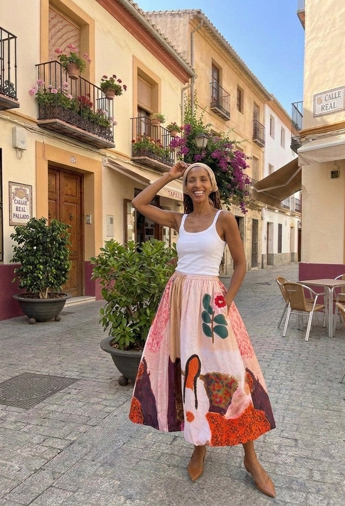 Stylishly making your day , this skirt features “ a girl on sofa and flower painting “ print ! dreamy ballon silhouette skirt makes it perfect for your outing for Anytime of day !