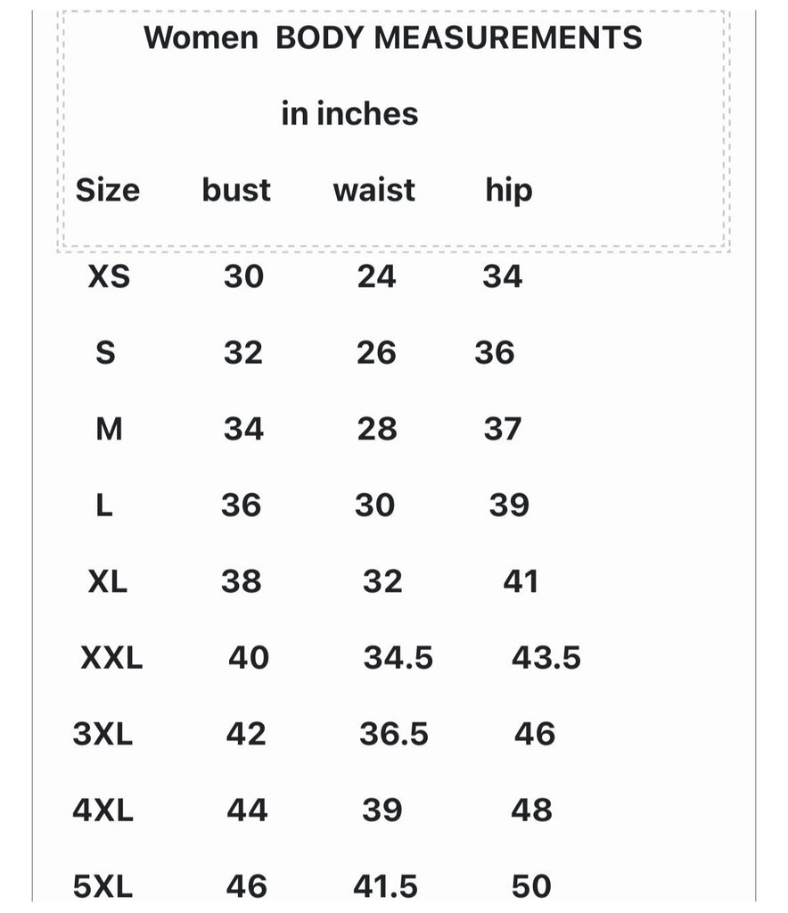 Women BODY MEASUREMENTS in inches Size bust waist hip |
